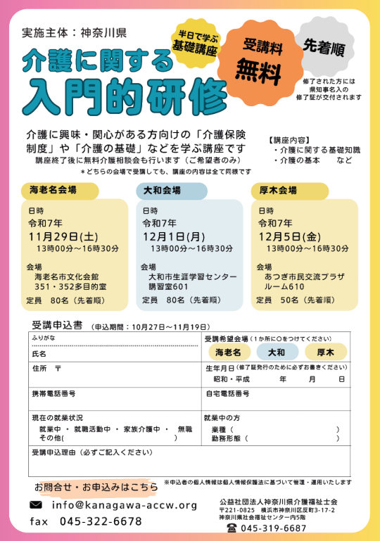 「介護に関する入門的研修」【県央地区】と【横須賀地区】開催のご案内