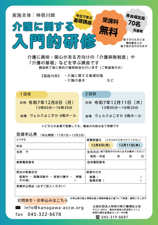 「介護に関する入門的研修」【県央地区】と【横須賀地区】開催のご案内
